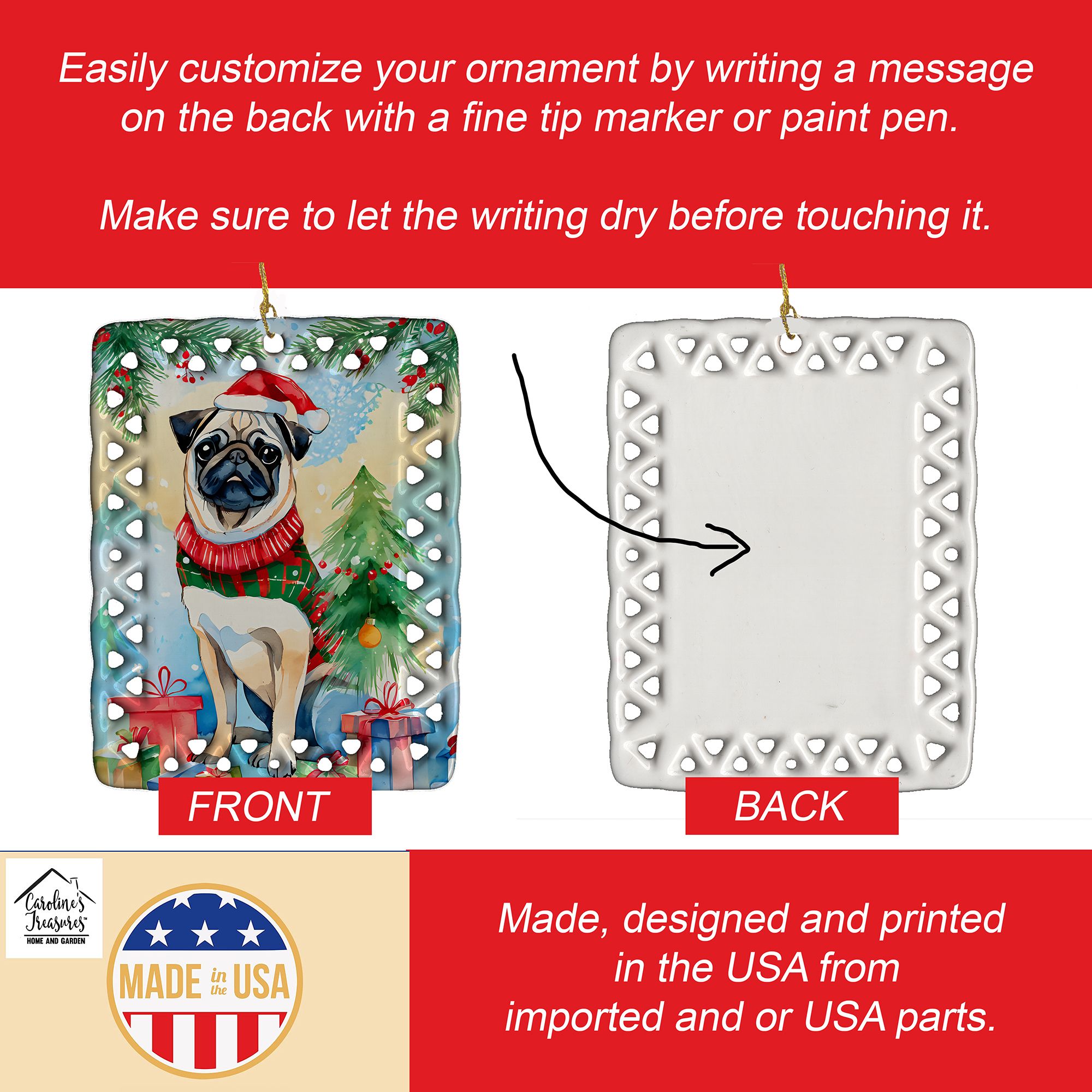Porcelain Ornament featuring breed specific Pug artwork. Celebrate Christmas with this Christmas Ornament. Add a unique, personal touch to your holiday decor with our Rectangular Lattice Porcelain Ornament. Perfect for creating cherished memories, this high-quality ornament shines under festive lights, reflecting warmth and joy throughout your Christmas tree. Crafted with a glossy finish, it showcases vibrant, full-color artwork contributed by our talented artists, ensuring your tree is adorned with a burst of color and holiday spirit. What sets this Porcelain Ornament apart is its customizable white back. Use a paint pen or permanent marker to write a heartfelt message, commemorate a special year, or mark an unforgettable date, turning this ornament into a keepsake that will be treasured for years to come. For best results, allow any personalization to dry thoroughly before handling. Each ornament comes complete with a delicate gold cord, making it easy to hang and display. Proudly made in the USA, this ornament measures 3.375 x 2.625 inches and is a thoughtful gift for pet sitters, teachers, family members, or anyone who would appreciate a little extra holiday magic. Bring style, charm, and a touch of personal meaning to your Christmas tree with this beautifully designed ornament..