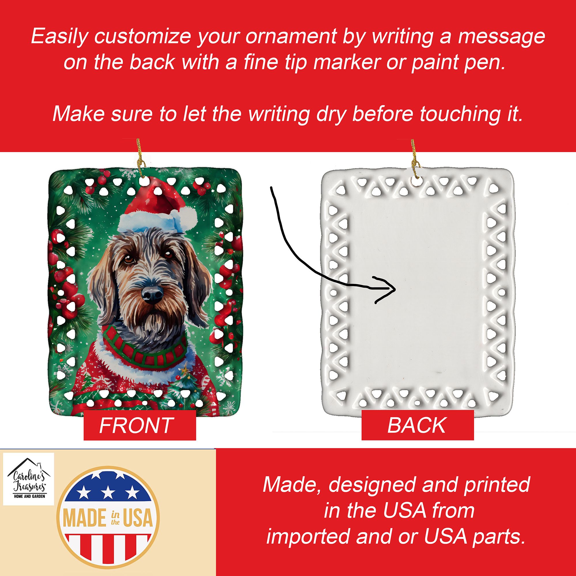 Porcelain Ornament featuring breed specific Wirehaired Pointing Griffon artwork. Celebrate Christmas with this Christmas Ornament. Add a unique, personal touch to your holiday decor with our Rectangular Lattice Porcelain Ornament. Perfect for creating cherished memories, this high-quality ornament shines under festive lights, reflecting warmth and joy throughout your Christmas tree. Crafted with a glossy finish, it showcases vibrant, full-color artwork contributed by our talented artists, ensuring your tree is adorned with a burst of color and holiday spirit. What sets this Porcelain Ornament apart is its customizable white back. Use a paint pen or permanent marker to write a heartfelt message, commemorate a special year, or mark an unforgettable date, turning this ornament into a keepsake that will be treasured for years to come. For best results, allow any personalization to dry thoroughly before handling. Each ornament comes complete with a delicate gold cord, making it easy to hang and display. Proudly made in the USA, this ornament measures 3.375 x 2.625 inches and is a thoughtful gift for pet sitters, teachers, family members, or anyone who would appreciate a little extra holiday magic. Bring style, charm, and a touch of personal meaning to your Christmas tree with this beautifully designed ornament..