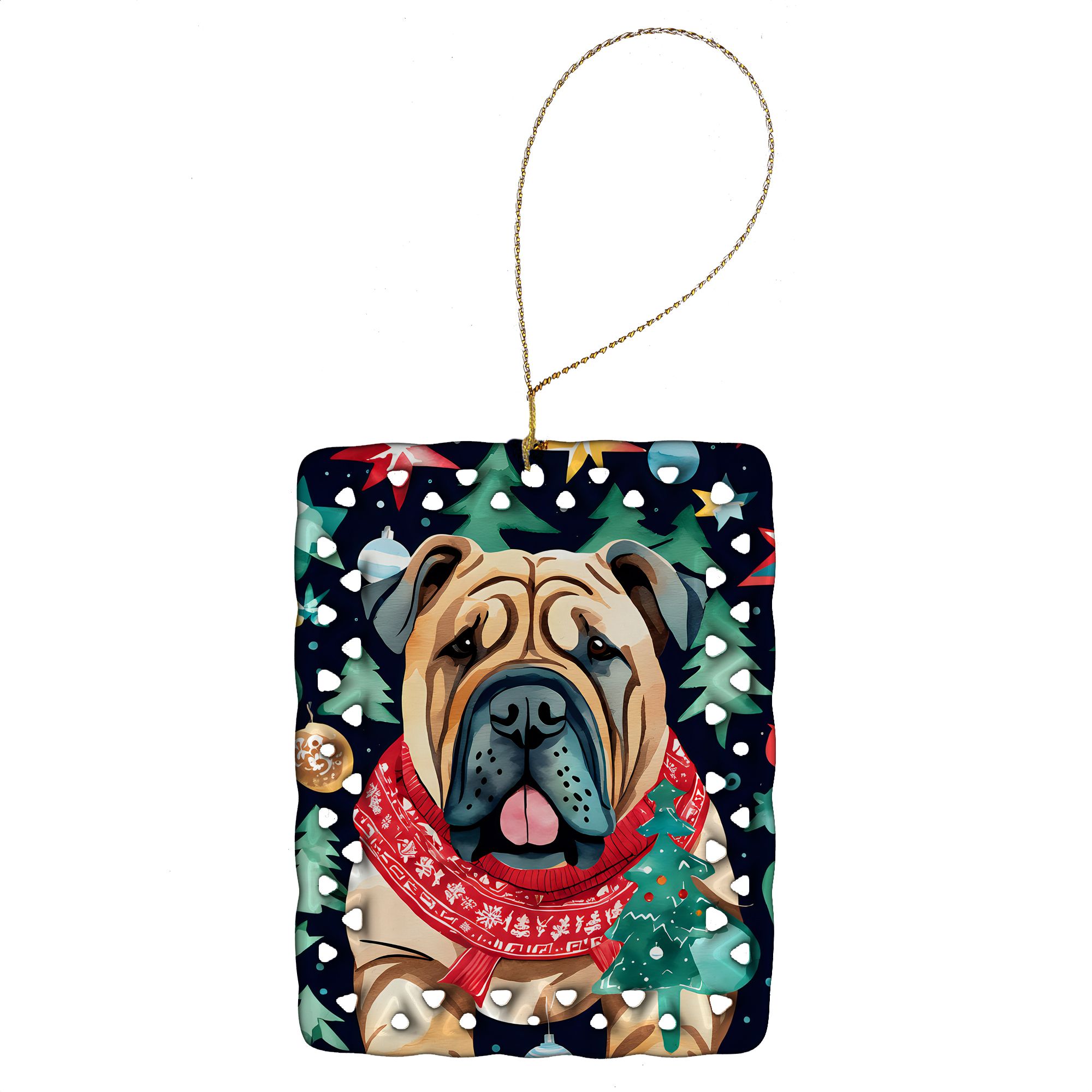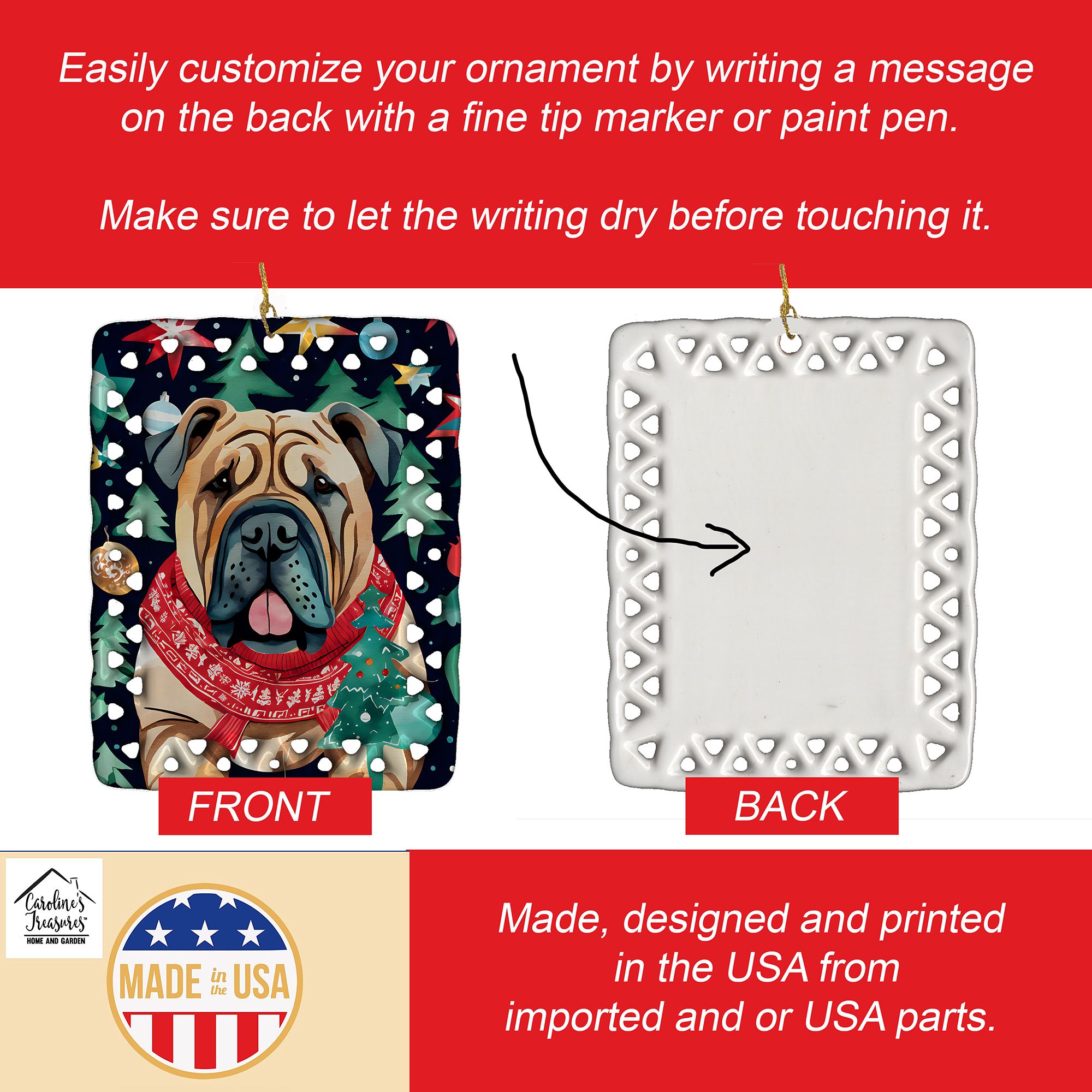 Porcelain Ornament featuring breed specific Shar Pei artwork. Celebrate Christmas with this Christmas Ornament. Add a unique, personal touch to your holiday decor with our Rectangular Lattice Porcelain Ornament. Perfect for creating cherished memories, this high-quality ornament shines under festive lights, reflecting warmth and joy throughout your Christmas tree. Crafted with a glossy finish, it showcases vibrant, full-color artwork contributed by our talented artists, ensuring your tree is adorned with a burst of color and holiday spirit. What sets this Porcelain Ornament apart is its customizable white back. Use a paint pen or permanent marker to write a heartfelt message, commemorate a special year, or mark an unforgettable date, turning this ornament into a keepsake that will be treasured for years to come. For best results, allow any personalization to dry thoroughly before handling. Each ornament comes complete with a delicate gold cord, making it easy to hang and display. Proudly made in the USA, this ornament measures 3.375 x 2.625 inches and is a thoughtful gift for pet sitters, teachers, family members, or anyone who would appreciate a little extra holiday magic. Bring style, charm, and a touch of personal meaning to your Christmas tree with this beautifully designed ornament..