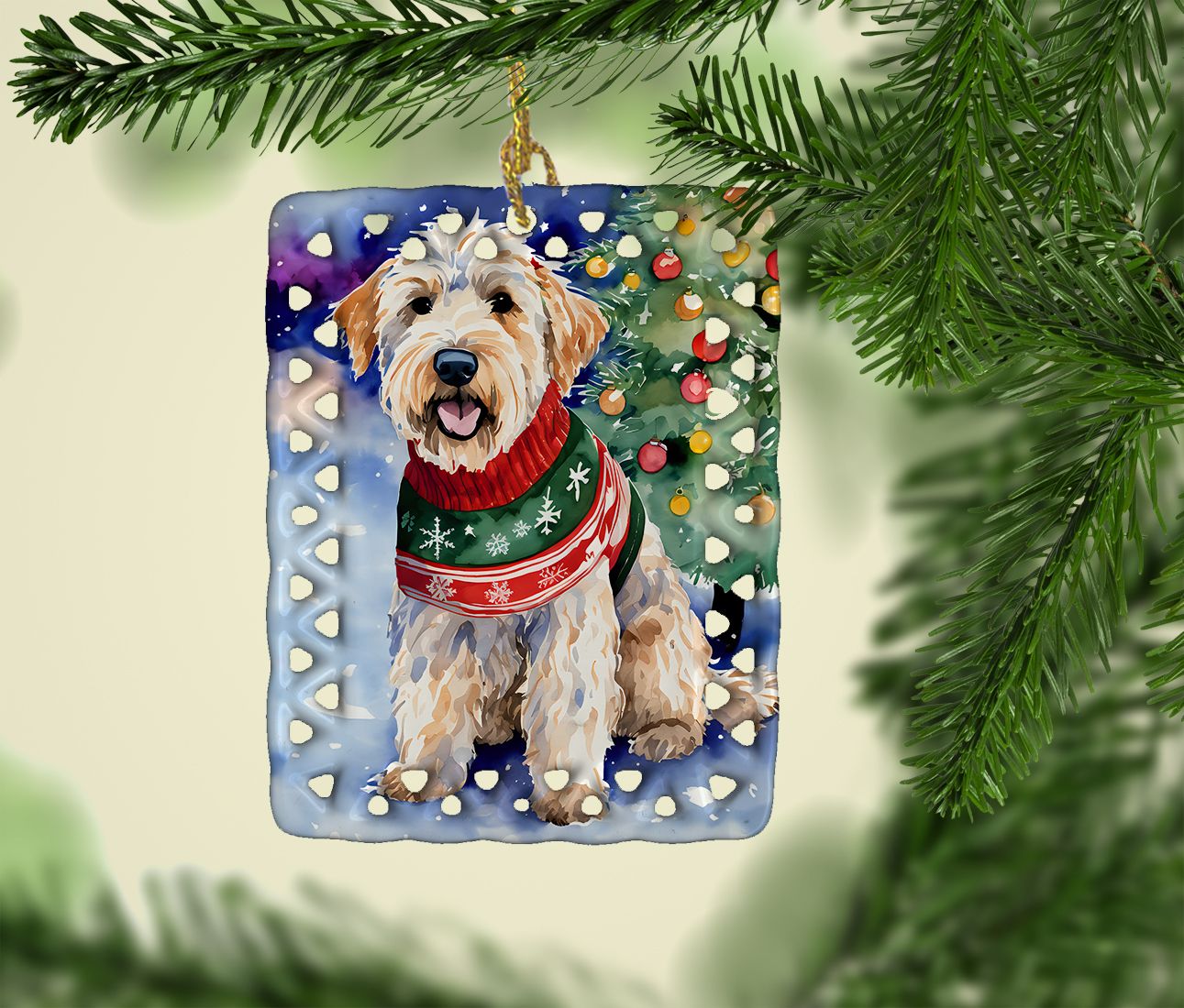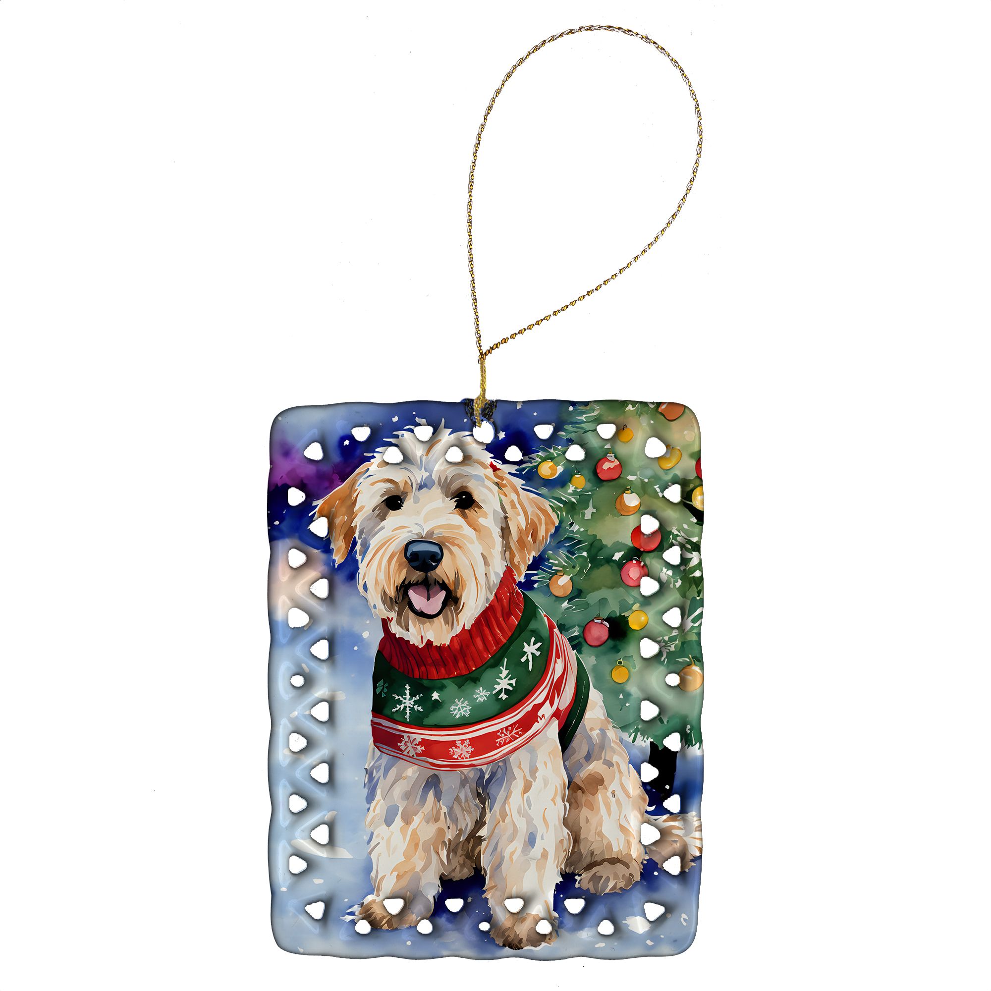 Porcelain Ornament featuring breed specific Soft Coated Wheaten Terrier artwork. Celebrate Christmas with this Christmas Ornament. Add a unique, personal touch to your holiday decor with our Rectangular Lattice Porcelain Ornament. Perfect for creating cherished memories, this high-quality ornament shines under festive lights, reflecting warmth and joy throughout your Christmas tree. Crafted with a glossy finish, it showcases vibrant, full-color artwork contributed by our talented artists, ensuring your tree is adorned with a burst of color and holiday spirit. What sets this Porcelain Ornament apart is its customizable white back. Use a paint pen or permanent marker to write a heartfelt message, commemorate a special year, or mark an unforgettable date, turning this ornament into a keepsake that will be treasured for years to come. For best results, allow any personalization to dry thoroughly before handling. Each ornament comes complete with a delicate gold cord, making it easy to hang and display. Proudly made in the USA, this ornament measures 3.375 x 2.625 inches and is a thoughtful gift for pet sitters, teachers, family members, or anyone who would appreciate a little extra holiday magic. Bring style, charm, and a touch of personal meaning to your Christmas tree with this beautifully designed ornament..