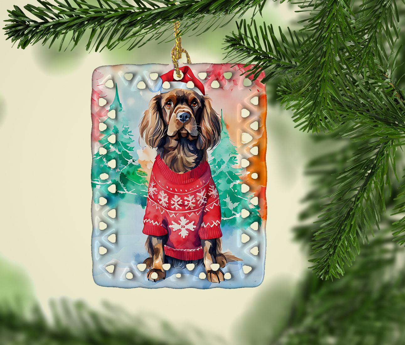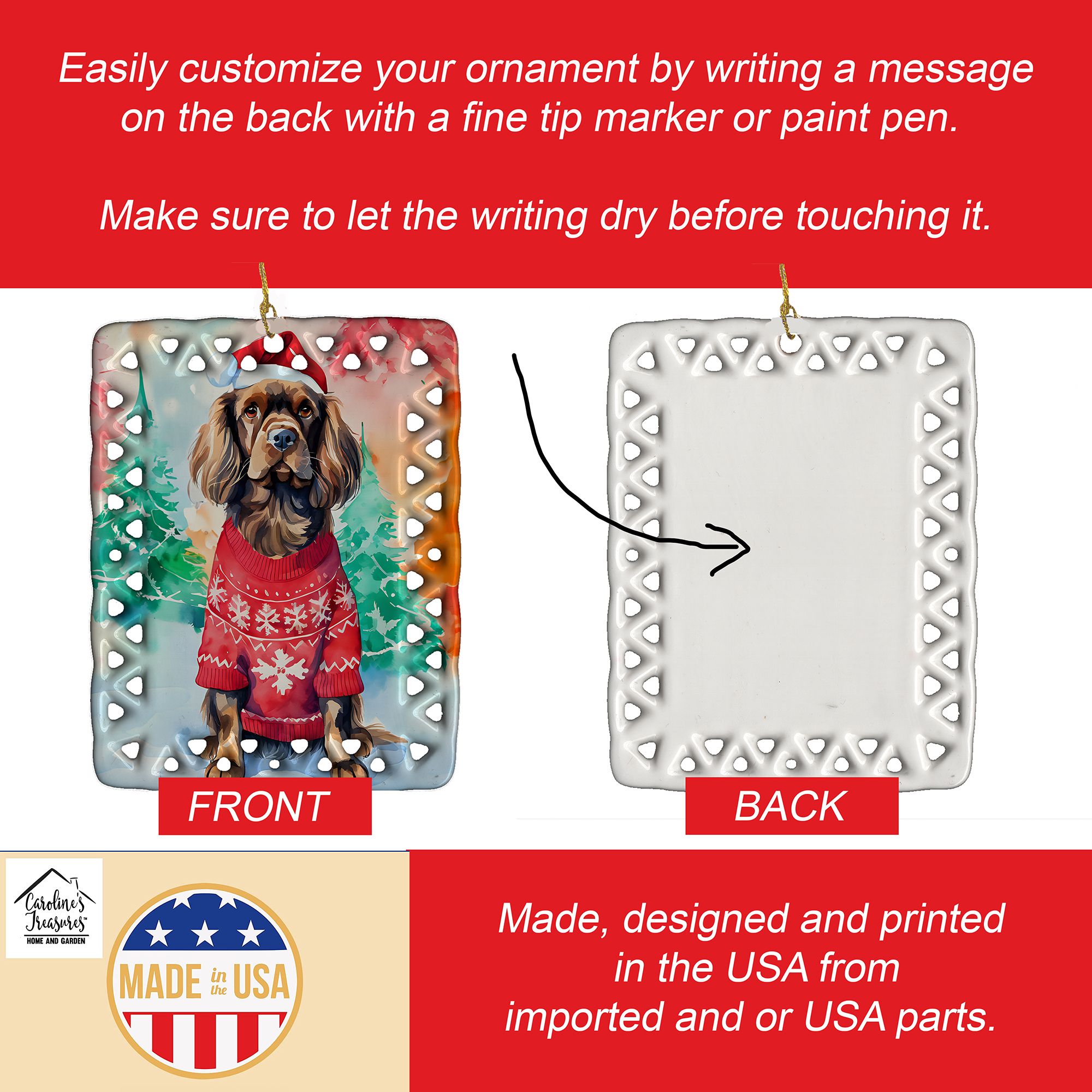 Porcelain Ornament featuring breed specific Sussex Spaniel artwork. Celebrate Christmas with this Christmas Ornament. Add a unique, personal touch to your holiday decor with our Rectangular Lattice Porcelain Ornament. Perfect for creating cherished memories, this high-quality ornament shines under festive lights, reflecting warmth and joy throughout your Christmas tree. Crafted with a glossy finish, it showcases vibrant, full-color artwork contributed by our talented artists, ensuring your tree is adorned with a burst of color and holiday spirit. What sets this Porcelain Ornament apart is its customizable white back. Use a paint pen or permanent marker to write a heartfelt message, commemorate a special year, or mark an unforgettable date, turning this ornament into a keepsake that will be treasured for years to come. For best results, allow any personalization to dry thoroughly before handling. Each ornament comes complete with a delicate gold cord, making it easy to hang and display. Proudly made in the USA, this ornament measures 3.375 x 2.625 inches and is a thoughtful gift for pet sitters, teachers, family members, or anyone who would appreciate a little extra holiday magic. Bring style, charm, and a touch of personal meaning to your Christmas tree with this beautifully designed ornament..
