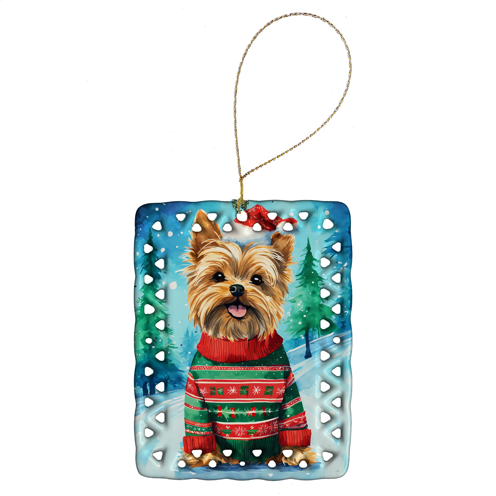 Porcelain Ornament featuring breed specific Yorkshire Terrier Yorkie artwork. Celebrate Christmas with this Christmas Ornament. Add a unique, personal touch to your holiday decor with our Rectangular Lattice Porcelain Ornament. Perfect for creating cherished memories, this high-quality ornament shines under festive lights, reflecting warmth and joy throughout your Christmas tree. Crafted with a glossy finish, it showcases vibrant, full-color artwork contributed by our talented artists, ensuring your tree is adorned with a burst of color and holiday spirit. What sets this Porcelain Ornament apart is its customizable white back. Use a paint pen or permanent marker to write a heartfelt message, commemorate a special year, or mark an unforgettable date, turning this ornament into a keepsake that will be treasured for years to come. For best results, allow any personalization to dry thoroughly before handling. Each ornament comes complete with a delicate gold cord, making it easy to hang and display. Proudly made in the USA, this ornament measures 3.375 x 2.625 inches and is a thoughtful gift for pet sitters, teachers, family members, or anyone who would appreciate a little extra holiday magic. Bring style, charm, and a touch of personal meaning to your Christmas tree with this beautifully designed ornament..