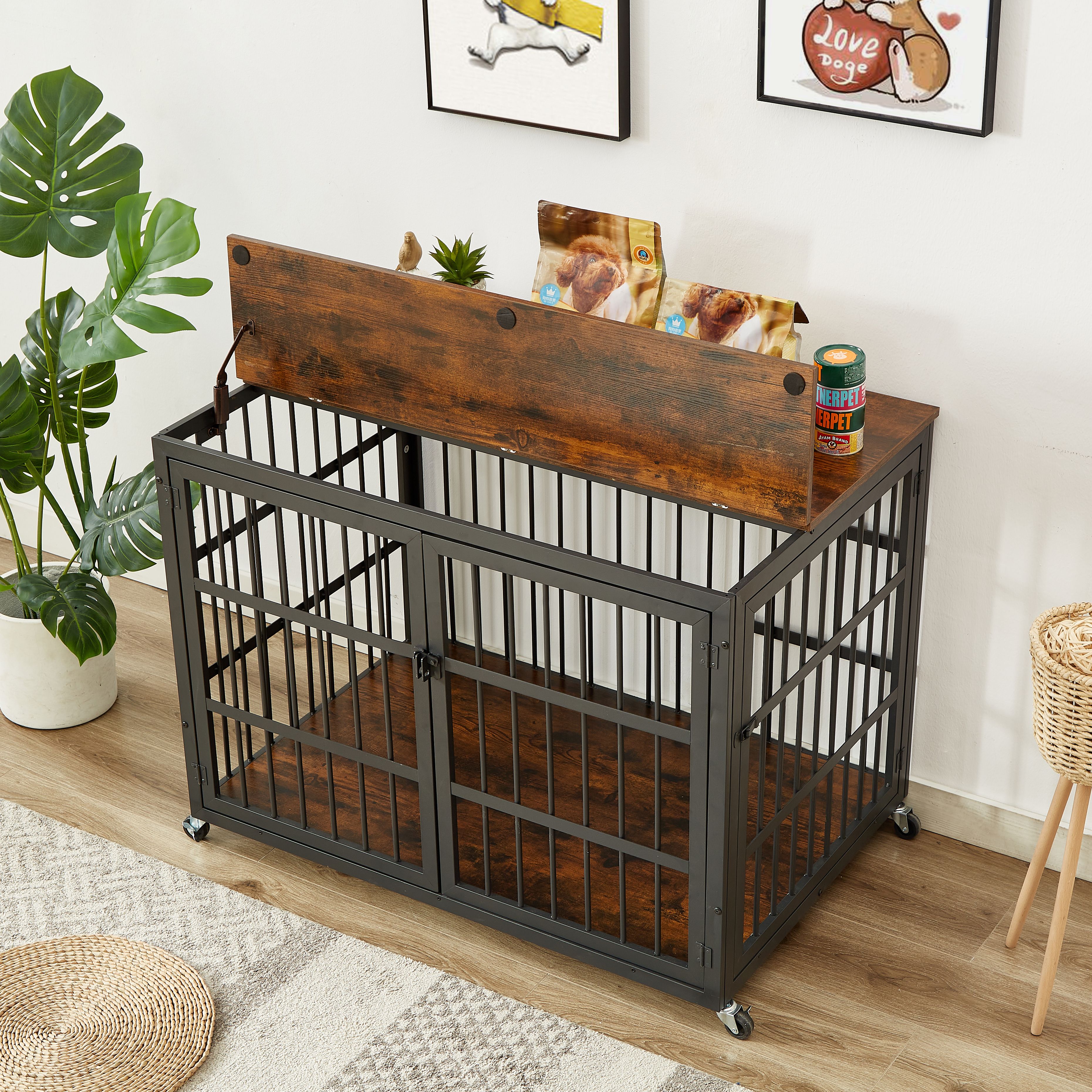 Furniture style dog crate wrought iron frame door with side openings, Grey, 43.3''W x 29.9''D x 33.5''H. Furniture style dog crate wrought iron frame door with side openings, Grey, 43.3''W x 29.9''D x 33.5''H. Furniture style dog crate wrought iron frame door with side openings, Grey, 43.3''W x 29.9''D x 33.5''H.