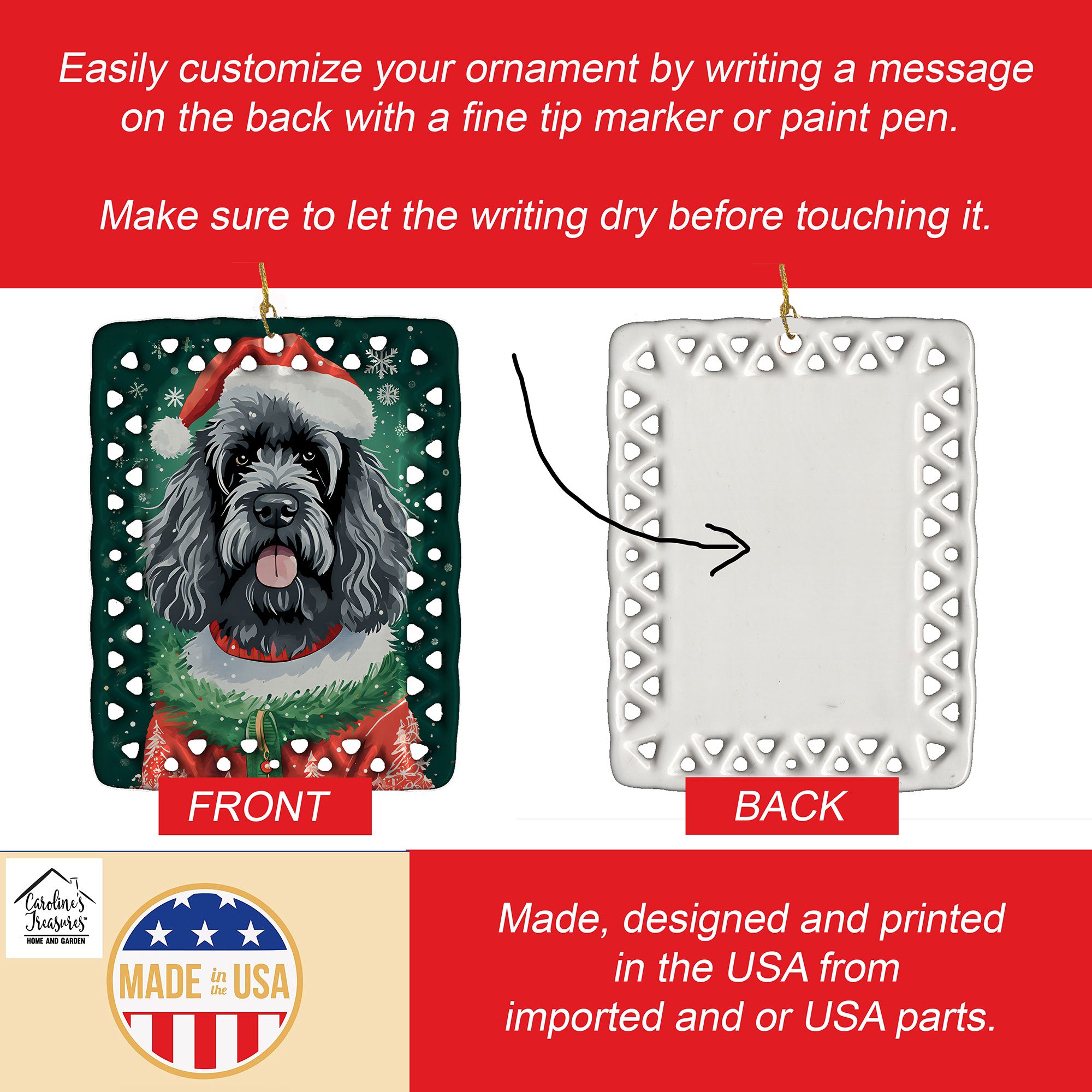 Porcelain Ornament featuring breed specific Portuguese Water Dog artwork. Celebrate Christmas with this Christmas Ornament. Add a unique, personal touch to your holiday decor with our Rectangular Lattice Porcelain Ornament. Perfect for creating cherished memories, this high-quality ornament shines under festive lights, reflecting warmth and joy throughout your Christmas tree. Crafted with a glossy finish, it showcases vibrant, full-color artwork contributed by our talented artists, ensuring your tree is adorned with a burst of color and holiday spirit. What sets this Porcelain Ornament apart is its customizable white back. Use a paint pen or permanent marker to write a heartfelt message, commemorate a special year, or mark an unforgettable date, turning this ornament into a keepsake that will be treasured for years to come. For best results, allow any personalization to dry thoroughly before handling. Each ornament comes complete with a delicate gold cord, making it easy to hang and display. Proudly made in the USA, this ornament measures 3.375 x 2.625 inches and is a thoughtful gift for pet sitters, teachers, family members, or anyone who would appreciate a little extra holiday magic. Bring style, charm, and a touch of personal meaning to your Christmas tree with this beautifully designed ornament..