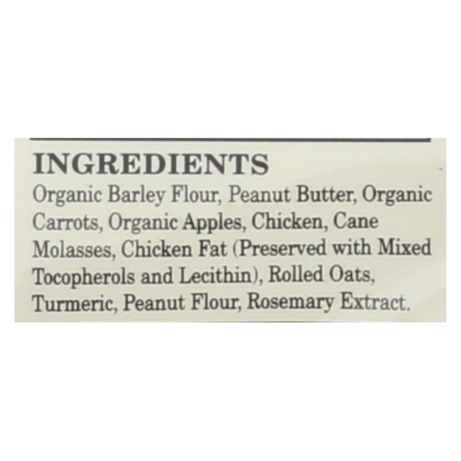ingredients : organic barley flour;peanut butter;organic carrots;organic apples;chicken;cane molasses;chicken fat;preserved with mixed tocopherols and lecithin;rolled oats;turmeric;peanut flour;rosemary extract