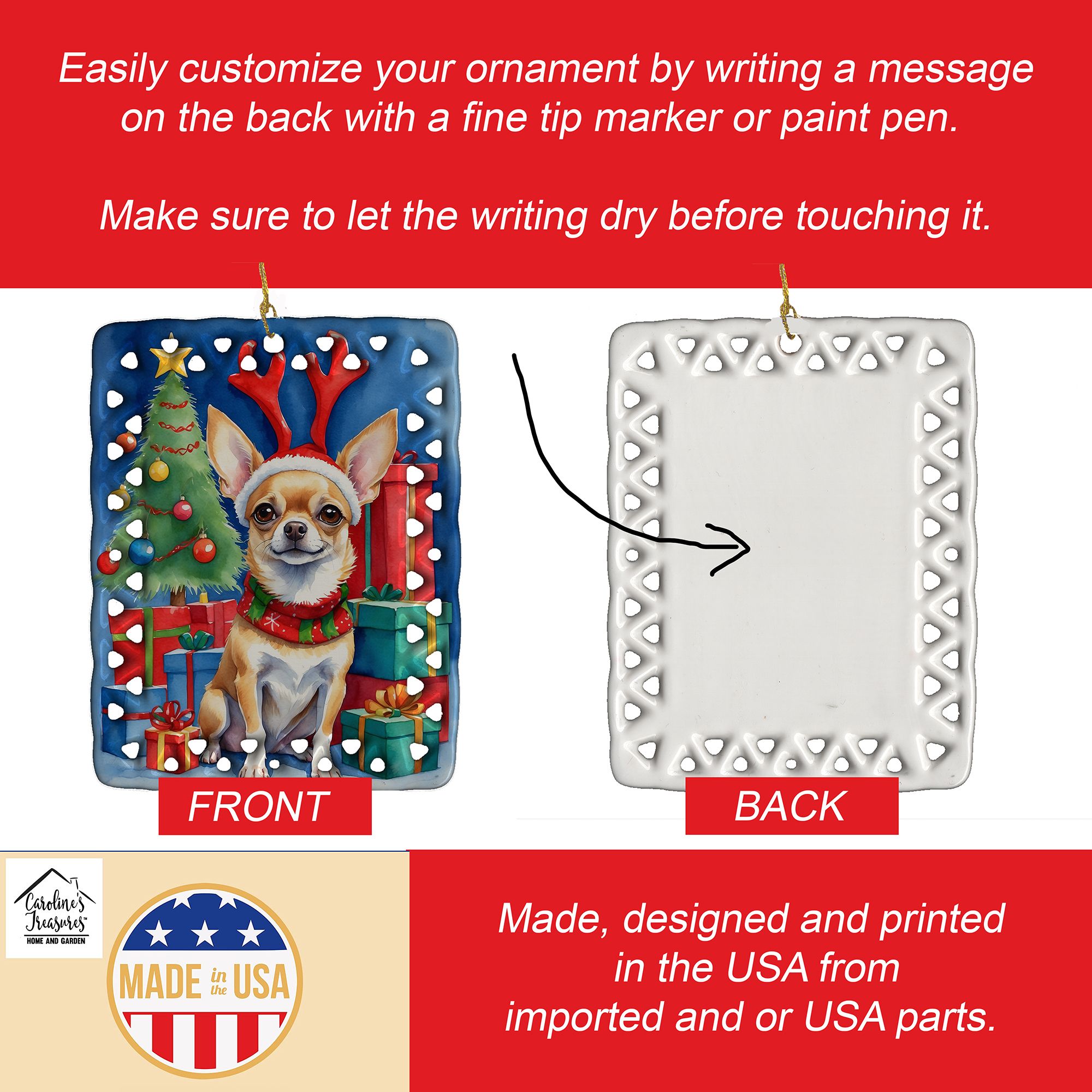 Porcelain Ornament featuring breed specific Chihuahua artwork. Celebrate Christmas with this Christmas Ornament. Add a unique, personal touch to your holiday decor with our Rectangular Lattice Porcelain Ornament. Perfect for creating cherished memories, this high-quality ornament shines under festive lights, reflecting warmth and joy throughout your Christmas tree. Crafted with a glossy finish, it showcases vibrant, full-color artwork contributed by our talented artists, ensuring your tree is adorned with a burst of color and holiday spirit. What sets this Porcelain Ornament apart is its customizable white back. Use a paint pen or permanent marker to write a heartfelt message, commemorate a special year, or mark an unforgettable date, turning this ornament into a keepsake that will be treasured for years to come. For best results, allow any personalization to dry thoroughly before handling. Each ornament comes complete with a delicate gold cord, making it easy to hang and display. Proudly made in the USA, this ornament measures 3.375 x 2.625 inches and is a thoughtful gift for pet sitters, teachers, family members, or anyone who would appreciate a little extra holiday magic. Bring style, charm, and a touch of personal meaning to your Christmas tree with this beautifully designed ornament..