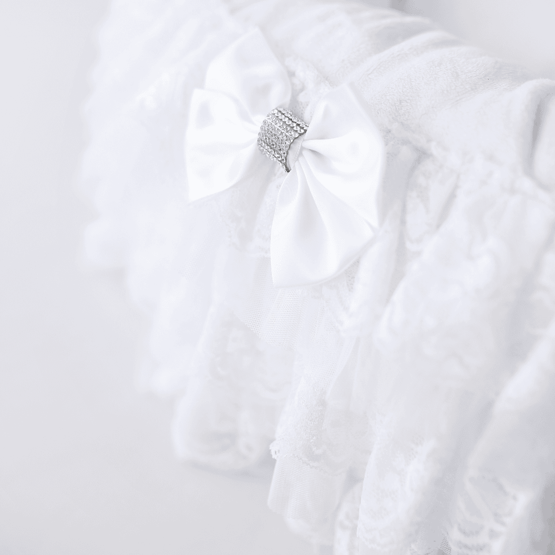 Introducing the Anastasia Dog Bed by Hello Doggie, the epitome of luxury and elegance for your beloved furry baby. Crafted from high-quality microsuede fabric and featuring exquisite two-tiered handmade romantic lace, this glamorous bed is truly fit for royalty. Adorned with our signature satin bows and a stunning brooch, it not only gives your baby a royal feeling but also adds a touch of sophistication to any room, making it a statement piece of elegant decor. Let your pet indulge in regal comfort while enhancing the aesthetic of your living space. For easy care, the pillow is removable and can we washed in cool water with no bleach or softener and air dry or tumble on low, spot clean the bed & lace. Dimensions Large -  23" x  8" (Inside Diameter 18")    |   For dogs up to 15 Lbs MSRP - $ 269.99 *Bed is handmade and sizes may vary slightly. Made in USA.