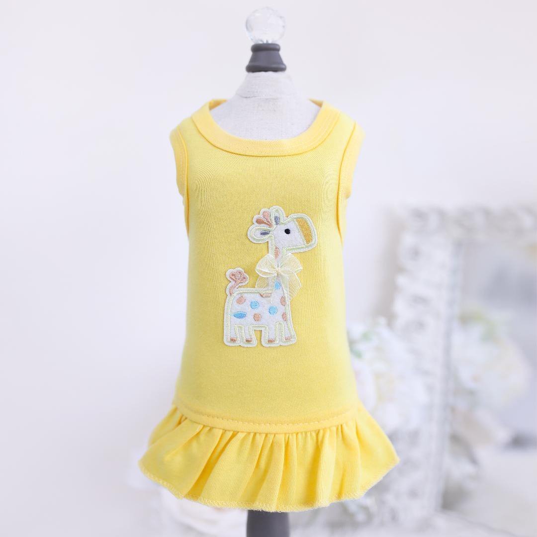 Style your baby in our new dress by Hello Doggie featuring a delicate baby giraffe adorned with a sweet sheer organza yellow bow. Wash on gentle cycle in cold water, no bleach or softner and air dry or tumble on low.  Always handcrafted with love in the USA by Hello Doggie. Sizes - XXS - L MSRP - $28.00 *LIMITED EDITION*