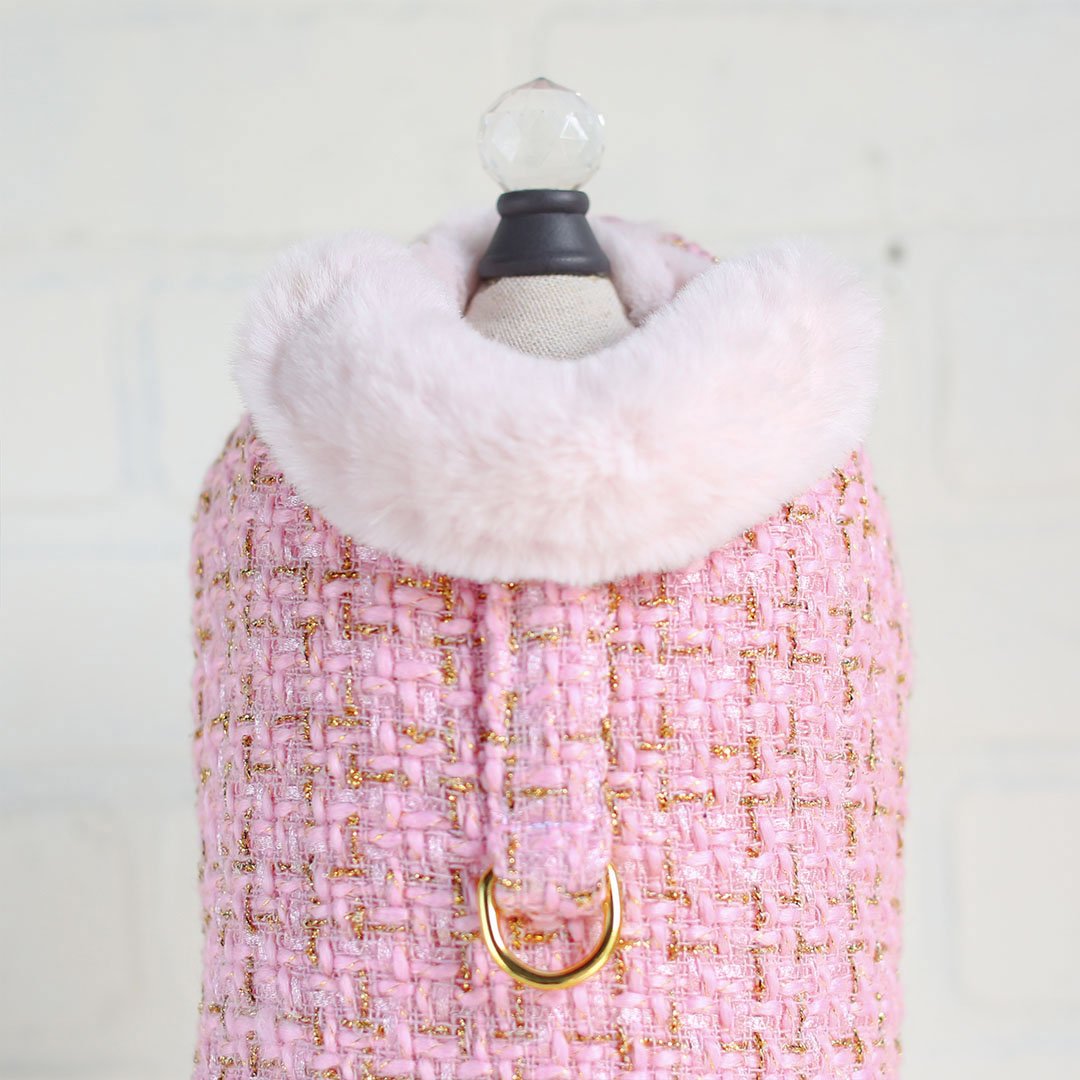 Your precious pooch will look regal in the Chantel Tweed Dog Coat by Hello Doggie. Our new coat collection was released just in time for the fall/winter season. When designing this coat we had the pooch in mind, our fur babies get cold too while they're out on the town for holiday shopping or a walk in the park. The coats are made from a beautiful soft tweed fabric and are lined with faux fur for a timeless design  and to keep out that extra chill. These coats are perfect to pair up with your favorite Hello Doggie sweater, featuring adjustable velcro straps for a perfect fit when adding layers. It is easy to care for, delicate wash with no softener or bleach and air dry. Our coats are fashionable and most importantly comfortable to wear. Each Coat has a matching harness, sold separately. Limited Edition MSRP $84.00 * Coats are handmade sizes may vary slightly. Made in USA.