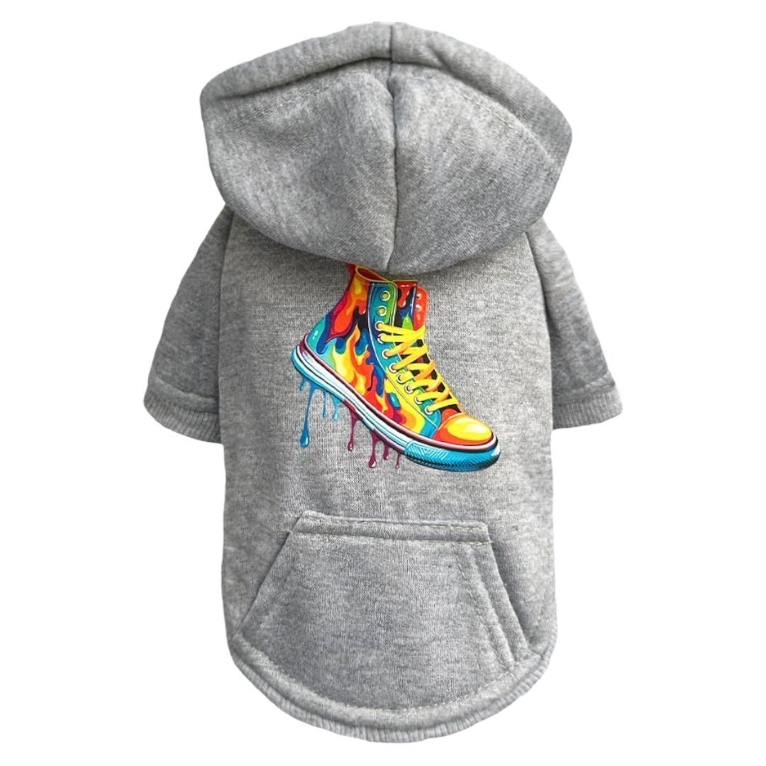 Keep your furry friend cozy and stylish with the Graffiti Pup Dog Hoodie by Hello Doggie. Crafted from premium fleece fabric, this hoodie provides the ultimate warmth and comfort, making it perfect for extra chilly days. Its trendy graffiti-inspired design adds a playful, urban touch to your dog's wardrobe, ensuring they stand out wherever they go. This hoodie is ideal for outdoor adventures or lounging indoors. Soft, durable, and lightweight, it offers all-day comfort, treat your pup to both functionality and fashion with this must-have hoodie! For easy care spot clean or hand wash in cool water. Sizes XXS - LG MSRP  $38.00 *Hoodies are handmade and sizes may vary slightly. Made in USA.