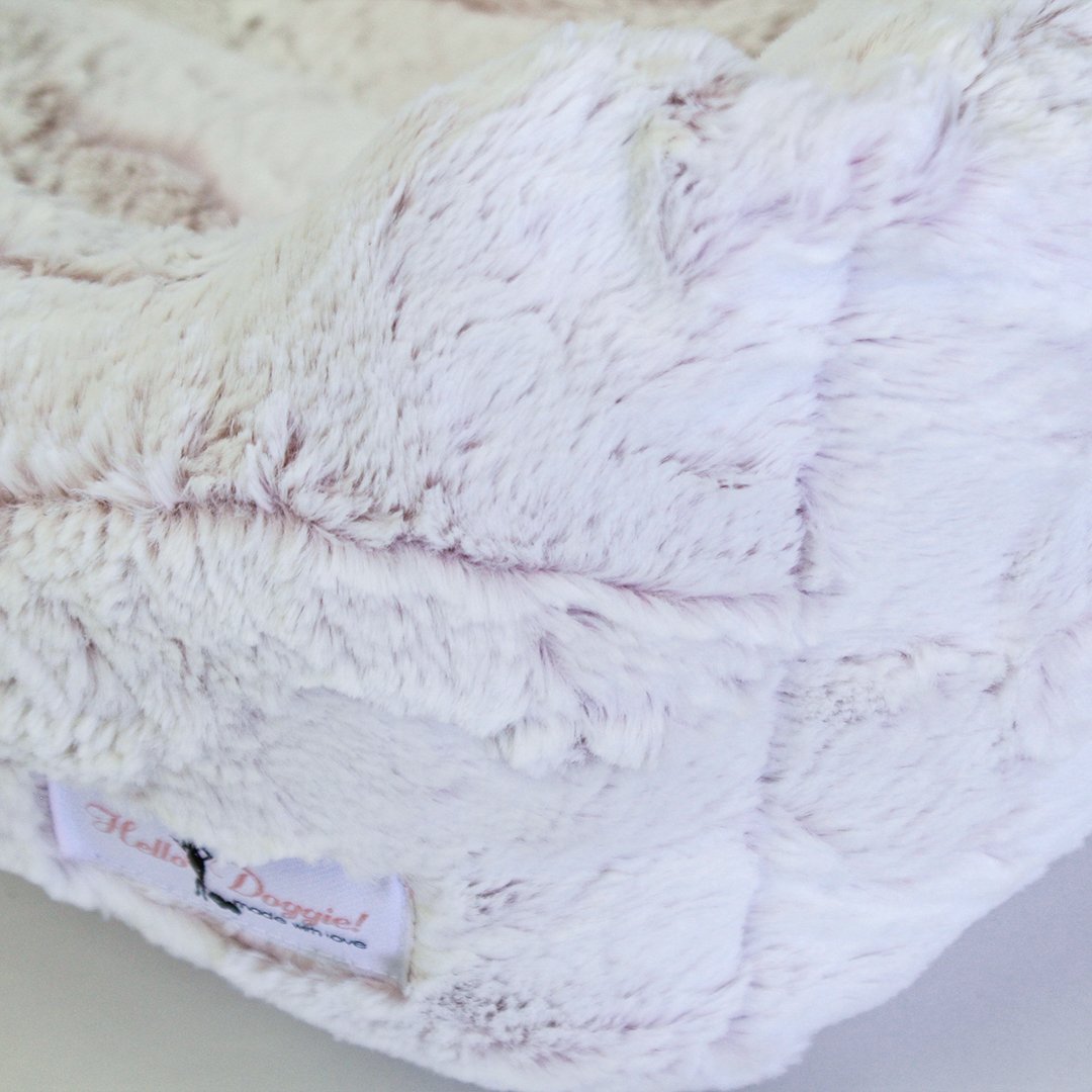 The Whisper Collection by Hello Doggie features high-quality soft fabric dog beds. This bed features a white fabric with a fluorescent tone peeping through. These soft-to-the-touch beds will have your pup snoozing away and cuddly wrapped in an ultra-soft matching dog blanket.  Dimensions Small Bed - 10" x 7"    |    For dogs up to 4 lbs MSRP - $99.99 Large Bed - 14" x 10"  |     For dogs up to 10 lbs MSRP - $119.99 *Bed is handmade and sizes may vary slightly. Made in USA.