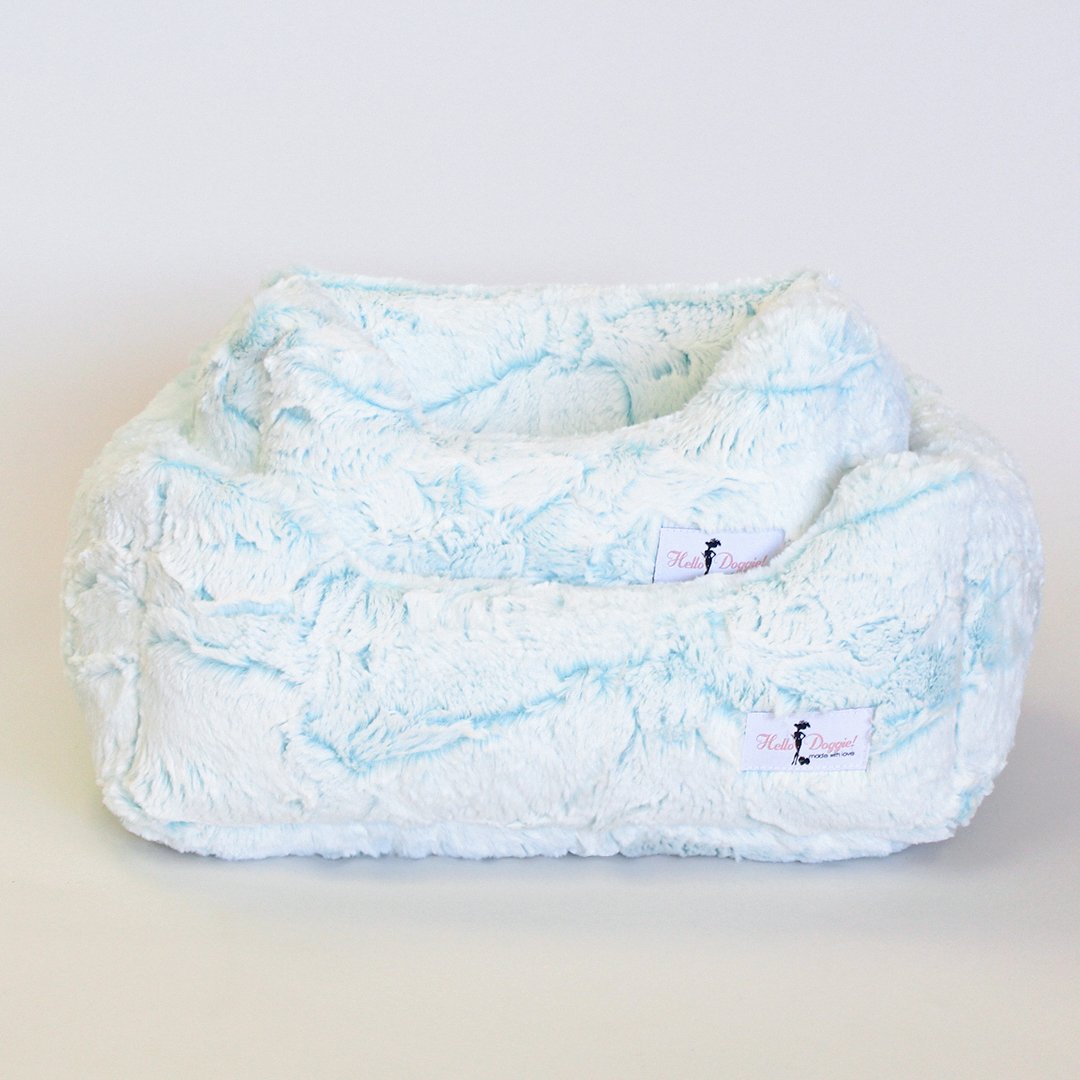 The Whisper Collection by Hello Doggie features high-quality soft fabric dog beds. This bed features a white fabric with a fluorescent tone peeping through. These soft-to-the-touch beds will have your pup snoozing away and cuddly wrapped in an ultra-soft matching dog blanket.  Dimensions Small Bed - 10" x 7"    |    For dogs up to 4 lbs MSRP - $99.99 Large Bed - 14" x 10"  |     For dogs up to 10 lbs MSRP - $119.99 *Bed is handmade and sizes may vary slightly. Made in USA.