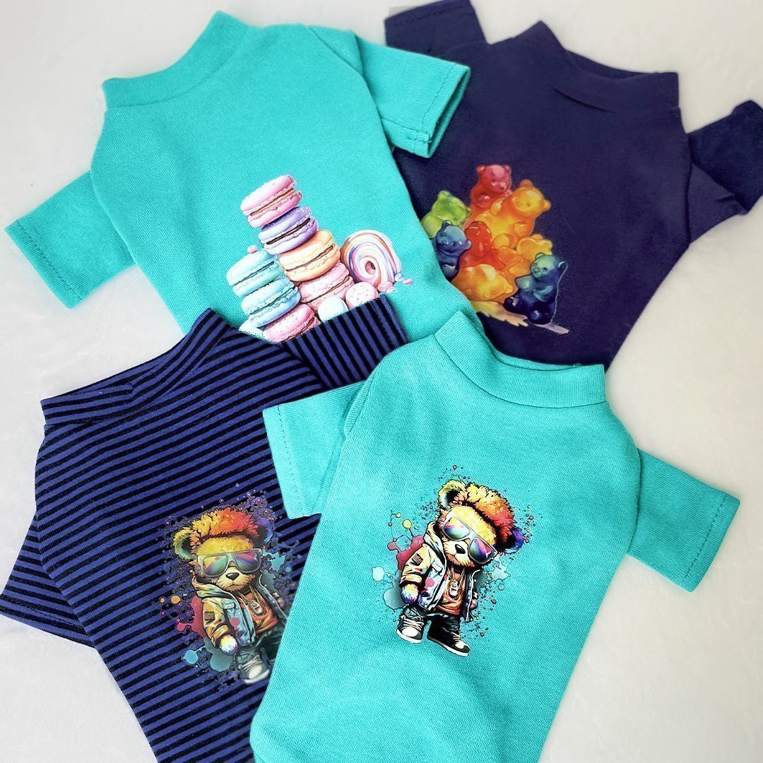 Introducing the Yummy Gummy Dog Tee by Hello Doggie, a delightful piece crafted from soft jersey cotton knit fabric. Made from 100% cotton, this tee offers a comfortable and breathable fit for your furry friend. The standout feature of this tee is the adorable gummy bear cluster appliqué, adding a touch of whimsy and charm to the design. Treat your pup to a stylish and comfortable look with this Yummy Gummy Dog Tee, perfect for everyday wear and showcasing your pet's fun personality. Make a sweet statement with this playful and cozy tee that is sure to become a favorite in your pet's wardrobe. Wash on gentle cycle in cold water, no bleach or softner and air dry or tumble on low.  Sizes | XXS – LG   MSRP $ 28.00  *Tees are handmade and sizes may vary slightly. Made in USA.